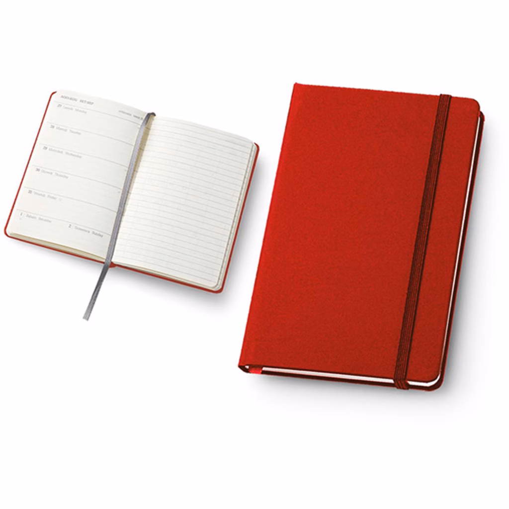Agenda taccuino con elastico - copertina in materiale rigido PVC - 160 pagine con giorni della settimana (a sinistra) e righe per appunti (a destra) stampate ad 1 colore su carta avorio da 70 g/m2- segnapagine - rubrica telefonica - fornita in astuccio di cartone bianco - formato chiuso cm 9x14,5
