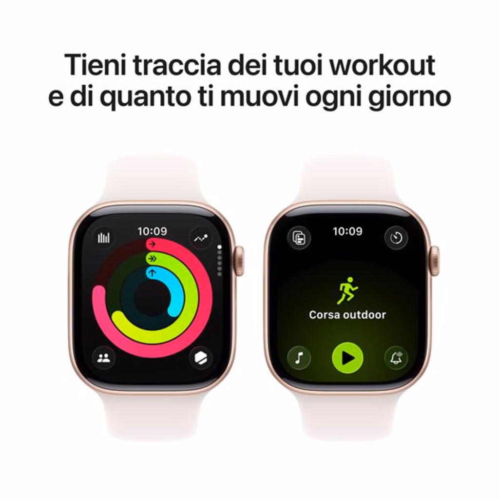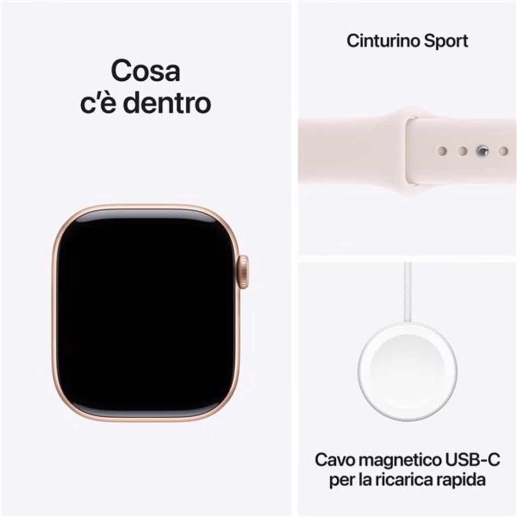 Apple Watch Series 11 GPS 46mm Cassa Alluminio Oro Rosa con Band Rosa Fard - M/LRicevi informazioni preziose sulla tua salute Apple Watch Series 11 ti offre informazioni preziose sulla tua salute, con notifiche in caso di frequenza cardiaca troppo alta o troppo bassa e dati sulla qualità del sonno. Migliora la tua forma fisica con parametri evoluti per tutti i tuoi allenamenti. E goditi fino a 24 ore di batteria. Caratteristiche principali - QUALITÀ DEL SONNO Un nuovo parametro che ti aiuta a controllare come dormi e a riposarti meglio. - ANCORA PIÙ INFORMAZIONI SULLA TUA SALUTE Ricevi notifiche se la frequenza cardiaca è troppo alta o troppo bassa, accedi ai dati sanitari raccolti mentre dormi nell app Parametri Vitali e misura il livello di ossigeno nel sangue. - DESIGN SPETTACOLARE Sottile e leggero, Series 11 è comodo da indossare tutto il giorno e anche mentre dormi, così puoi monitorare i tuoi parametri vitali 24 ore su 24. - IL TUO COMPAGNO DI FITNESS IDEALE Parametri evoluti per tutti i tuoi allenamenti, funzioni come Ritmo definito, Zone di frequenza cardiaca e Carico di allenamento, e molto altro. In più, con Series 11 hai tre mesi gratis di Apple Fitness+. - TANTA AUTONOMIA IN PIÙ Fino a 24 ore di utilizzo normale.1 E ricarica rapida per avere fino a 8 ore di utilizzo normale in soli 15 minuti. - FATTO PER DURARE Display ultrarobusto con vetro due volte più resistente ai graffi rispetto a Series 10. Resistenza all acqua fino a 50 m e resistenza alla polvere di grado IP6X. - FUNZIONI PER LA SICUREZZA Se hai avuto una brutta caduta o un grave incidente d auto, Series 11 può accorgersene, aiutarti a chiamare i soccorsi e inviare una notifica ai tuoi contatti di emergenza. Invece, la funzione Tutto bene , può automaticamente avvisare una persona cara appena arrivi a destinazione. - SEMPRE IN CONTATTO Manda messaggi, rispondi a una chiamata, ascolta musica, usa Siri e leggi le notifiche. Insieme al tuo iPhone o sotto rete Wi-Fi, Series 11 (GPS) ti tiene in contatto col mondo.Il massimo per una vita più sana.Apple Watch può fare cose che gli altri dispositivi nemmeno si sognano, perché è sempre con te. Quando lo indossi, hai subito dati utili sulla salute, un compagno di fitness che misura ogni tuo movimento, funzioni per la sicurezza, e un sacco di modi per rimanere in contatto con le persone e le cose a cui tieni.SaluteBuonanotte. Sarà un buon giorno.