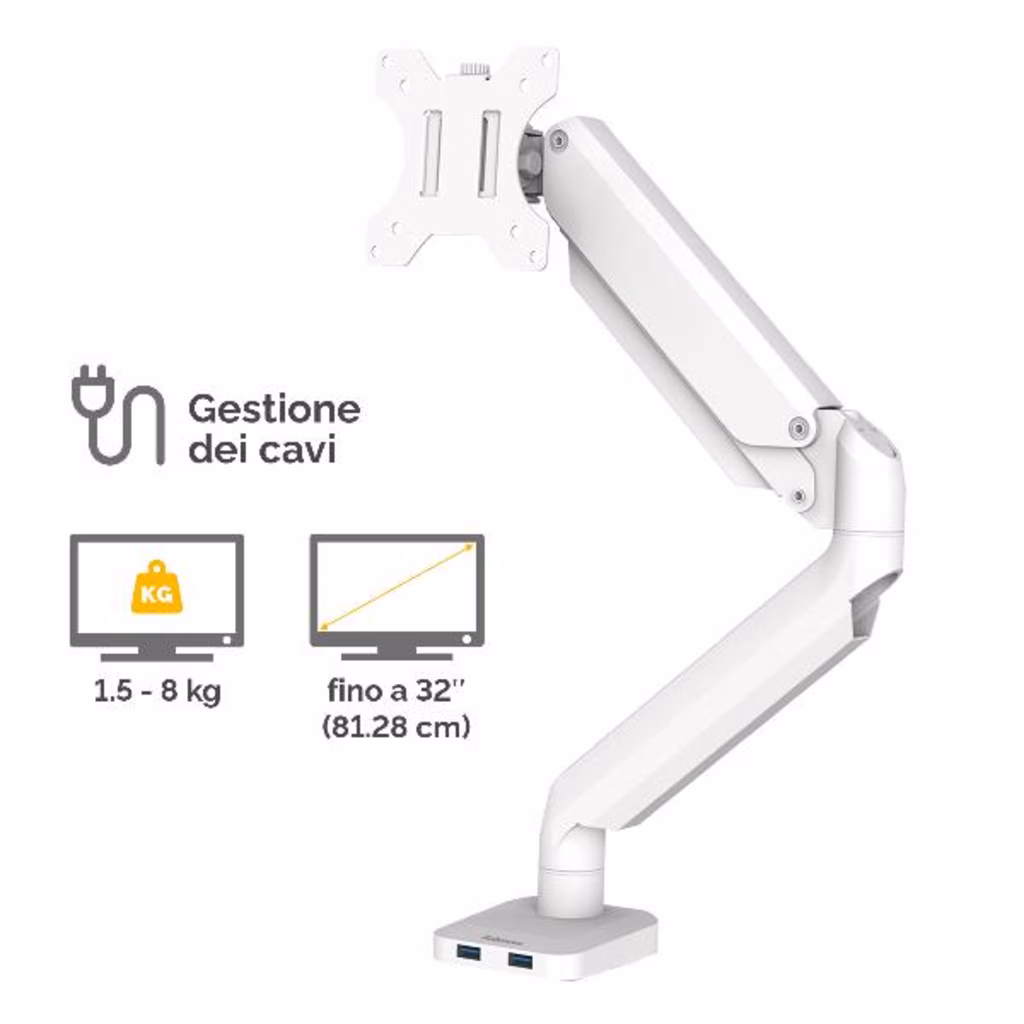Braccio monitor singolo completamente regolabile con tecnologia a molle a gas per spostamenti e regolazioni senza sforzi del monitor.