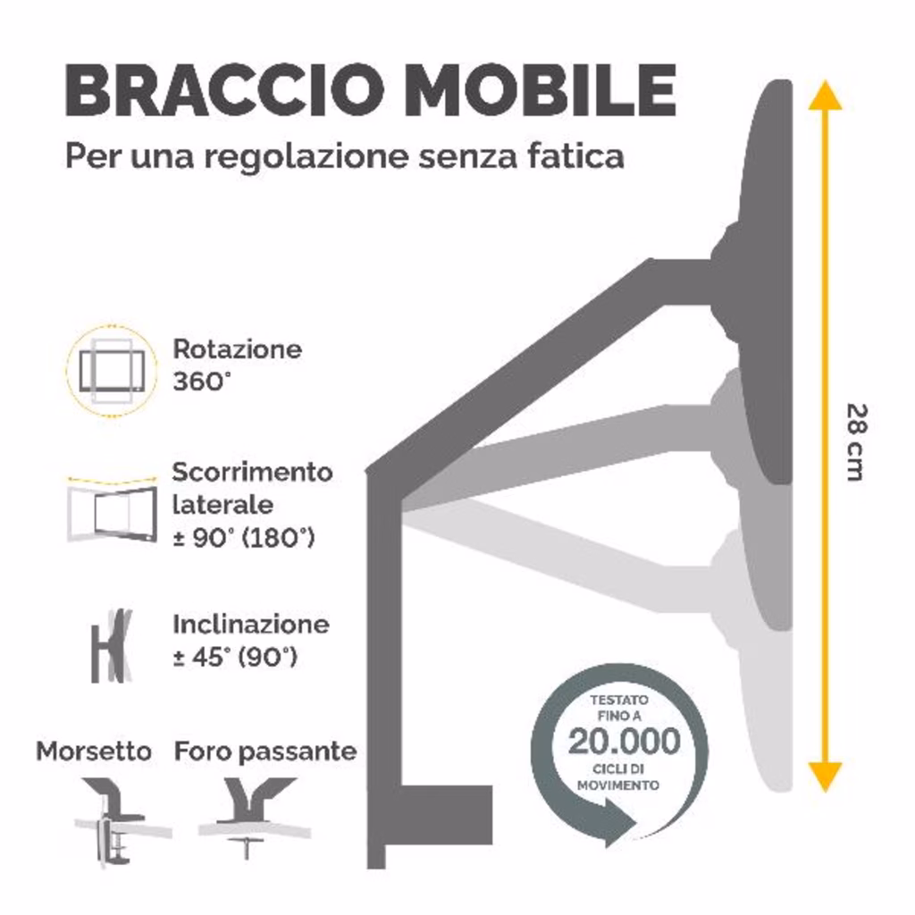 Caratteristiche: +/-45° Inclinazione, 180° Scorrimento, 360° Rotazione.
