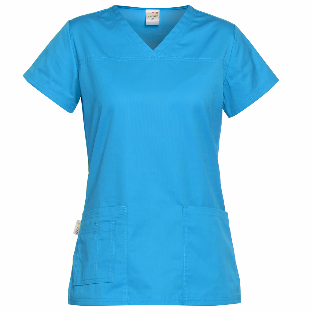 Casacca da donna stretch tinta unita, collo a V, due tasche frontali di cui una con porta penna. Composizione tessuto: 63% poliestere - 35% cotone - 2% elastan