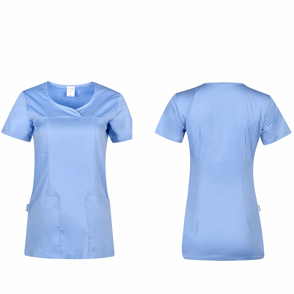 Casacca donna Ines Slim Fit collo a V manica corta con due tasche frontali spacchi laterali sfiancata sulla schiena. Composizione tessuto: 65% poliestere - 35% cotone