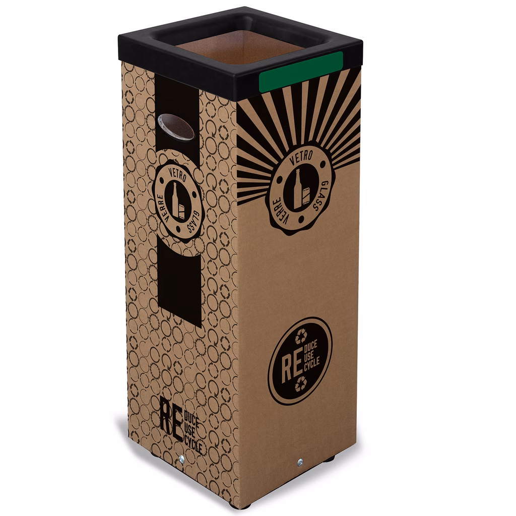 Cestini per raccolta differenziata realizzati in robusto cartone spessore mm 7 con coperchio in plastica riciclata nera + 4 adesivi colorati e fondo in lamiera verniciata con piedi salvapavimento in polopropilene - forniti stesi per il minimo ingombro, si montano facilmente con cacciavite