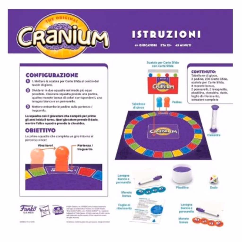 Cranium è un gioco per adulti davvero divertente, tra i più venduti ed apprezzati. Muoviti all'interno del tabellone che è diviso in quattro parti, ogni parte caratterizzata da un colore. Quando ti trovi su una parte del tabellone, dovrai adempiere ai vincoli della categoria.