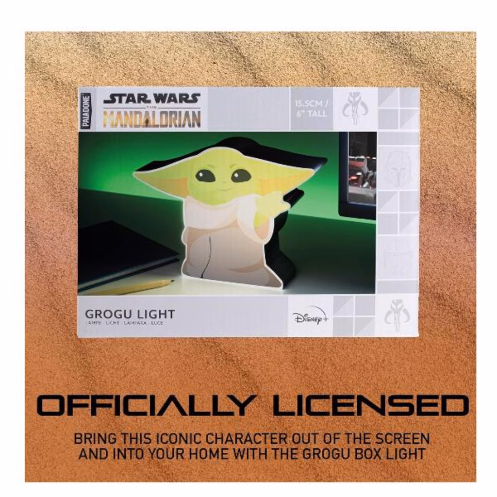 La lampada alta 15 cm (6") ha la forma di Grogu di The Mandalorian. La caratteristica testa verde e le orecchie oversize del bambino, così come le sue tipiche vesti da giovane, sono stampate sulla parte anteriore della luce del personaggio in stile scatola.