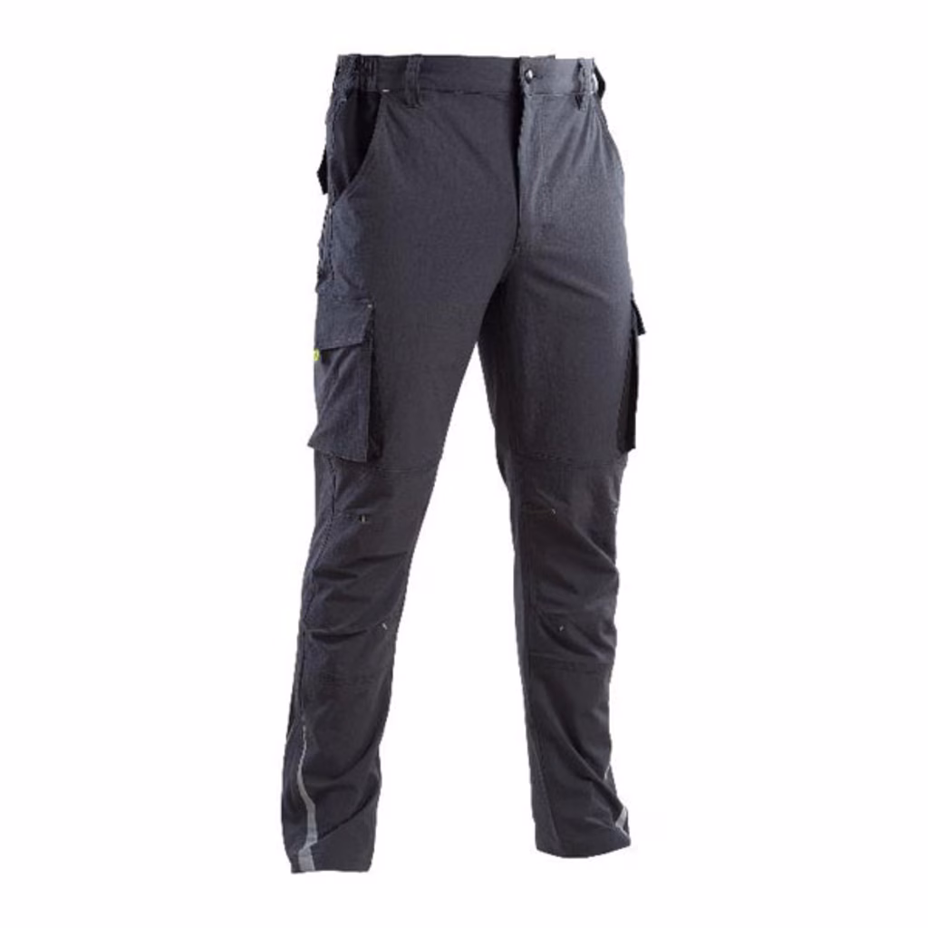 Pantalone superstretch con elastici ai fianchi - dettagli rifrangenti sul fondo gamba - travette in tinta giallo fluo - ginocchia preformate chiusura centrale con cerniera e bottone - 2 tasche anteriori a filetto - doppio tascone laterale con pattina chiusa da velcro - 2 tasche posteriori chiuse con pattina e velcro - doppie cuciture nei punti di maggiore sforzo