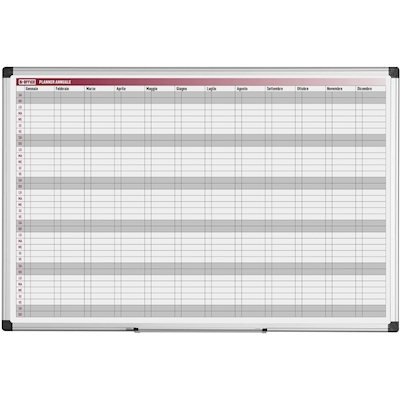 Un'agenda annuale che può essere riutilizzata anno dopo anno è lo strumento perfetto per gestire il personale, gli eventi, le riunioni o gli appuntamenti durante tutto l'anno. I mesi sono stampati in tedesco e in inglese e ogni voce ha uno spazio di 5,8 x 1,4 cm per dati, note o attività. La superficie magnetica della lavagna bianca cancellabile a secco consente l'uso di accessori magnetici come strisce magnetiche colorate per evidenziare note, attività e programmi. La superficie in acciaio della lavagna bianca è consigliata per un uso regolare, con l'uso occasionale di detergenti per lavagne bianche per ottenere prestazioni ottimali. Dimensioni 90 x 60 cm.