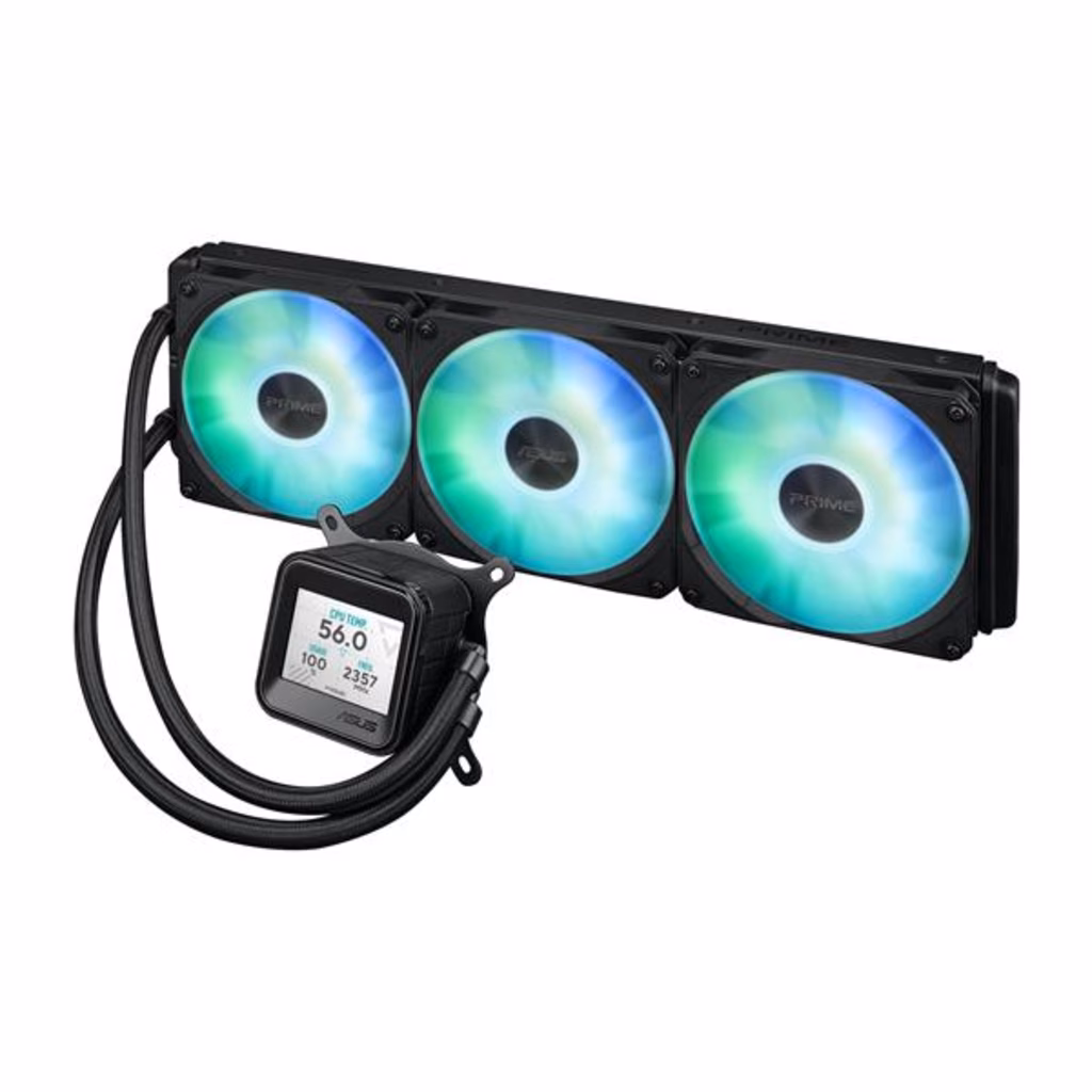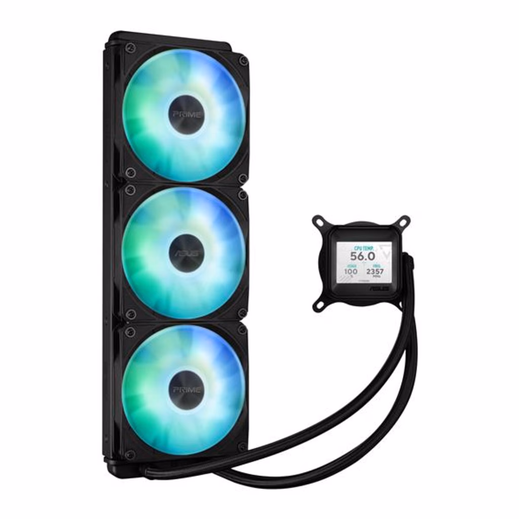 ASUS Prime LC ARGB LCD all-in-one CPU liquid cooler con schermo nitido che mostra le informazioni su CPU e GPU con diversi sfondi, pompa Asetek ad alte prestazioni dotata di un robusto motore, ventole collegabili in cascata