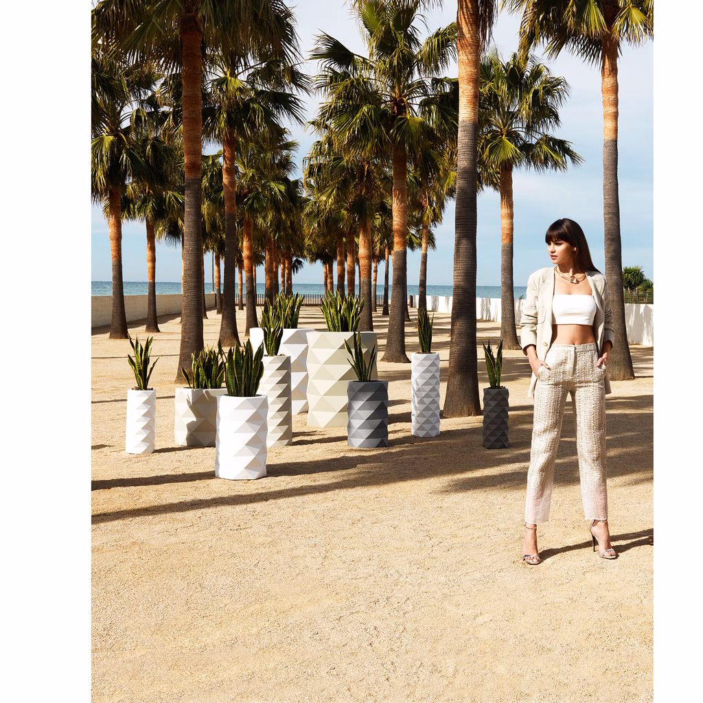 Originato dall'ispirazione del taglio del diamante. Il suo design poligonale richiama sfaccettature create attraverso il taglio. Le forme chiare ed eleganti creano un'enorme visuale d'impatto. In polietilene per uso interno/esterno in finitura laccata. 100% riciclabile. ORDINE MINIMO URO 1000,00+Iva, altrimenti contributo trasporto uro 75,00+Iva